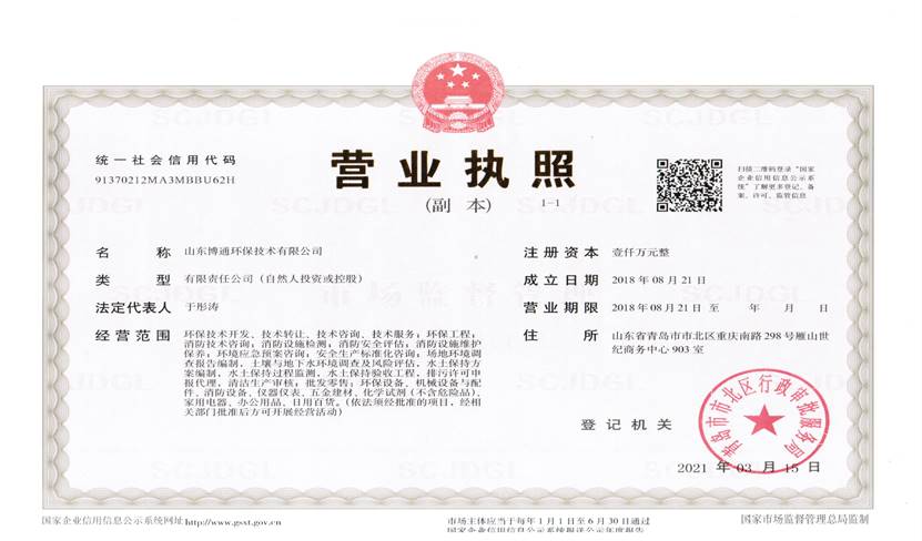 山東博通環保技術有限公司是一家專業從事環保、安全、消防的多元化技術服務公司,公司致力于打造專業的技術服務團隊,立足青島,輻射山東,服務范圍涵蓋:環保技術開發、技術轉讓、技術咨詢、技術服務;環保工程;消防技術咨詢;消防設施檢測;消防安全評估;消防設施維護保養;環境應急預案咨詢;安全生產標準化咨詢;場地環境調查報告編制,土壤與地下水環境調查及風險評估,水土保持方案編制,水土保持過程監測,水土保持驗收工程,排污許可申報代理,清潔生產審核;...